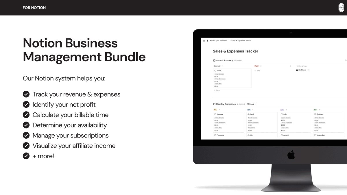 Manage your business, ditch uncertainty, and avoid burnout with our Notion system.